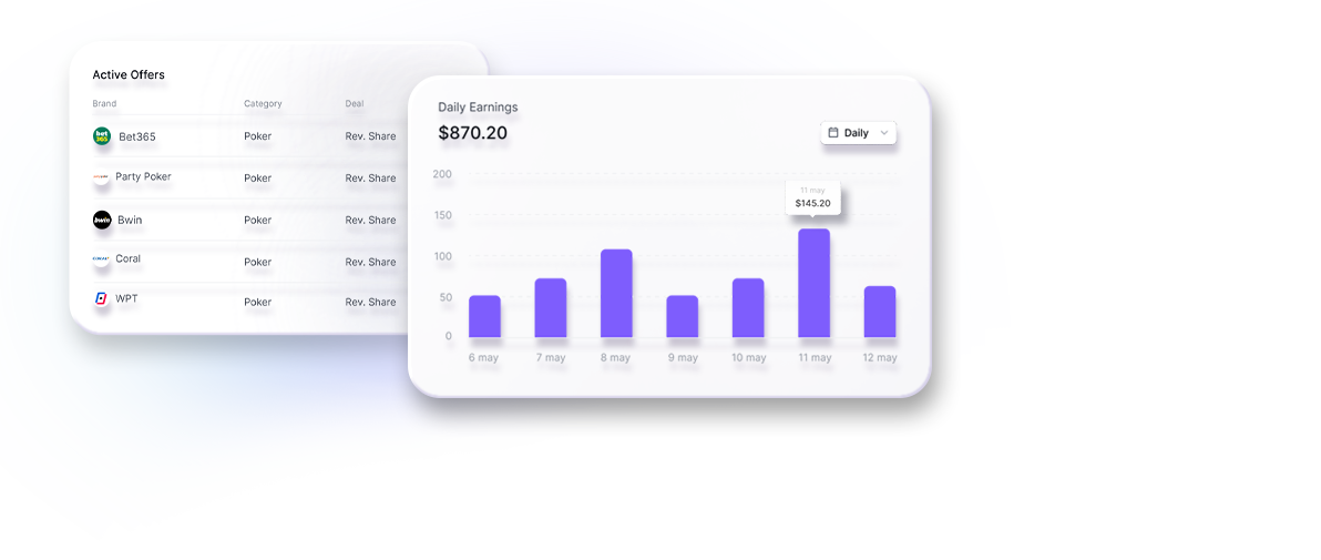 With Paynura,poker content creators and agents can effortlessly access multiple poker affiliate deals, effectively manage all promotions from one place, and, most importantly, conveniently collect affiliate commissions from one cashier.